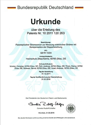 Professor Thiele and his colleagues Christian Winkler, Andreas Pohl, Bernd Schwarz and Andreas Israel receive the patent on the topic "Fiber optic current sensor for measuring electrical currents with compensation of birefringence".