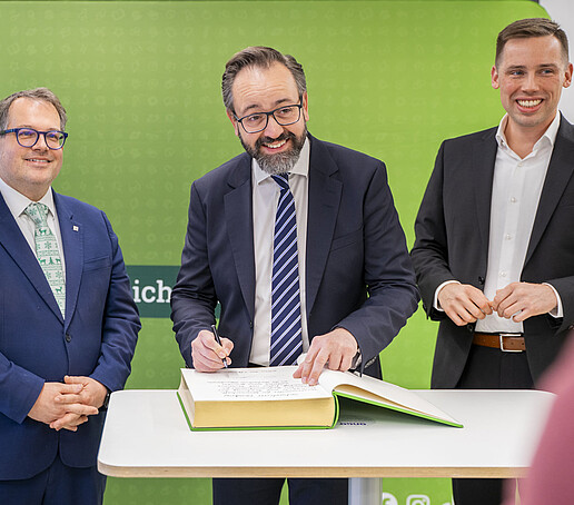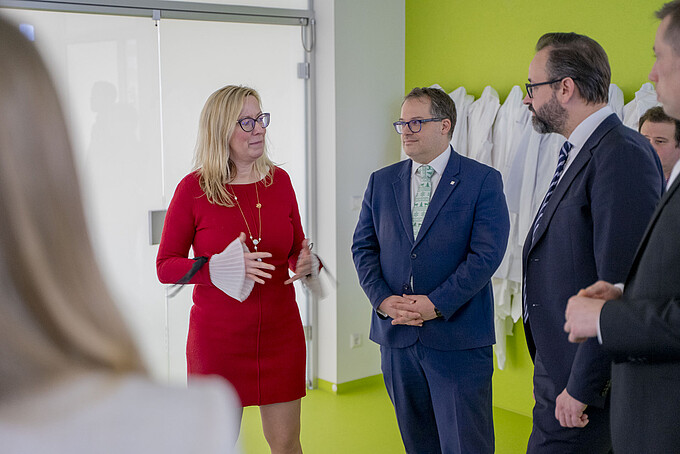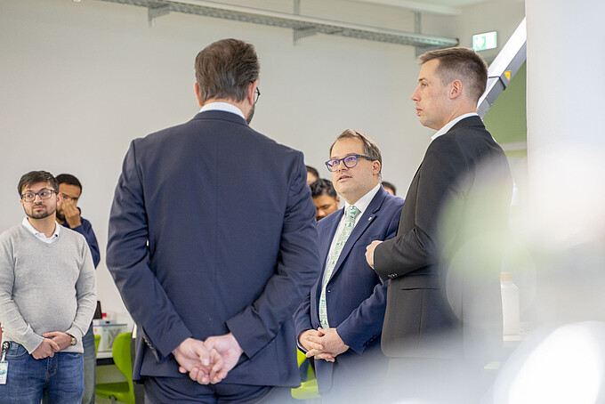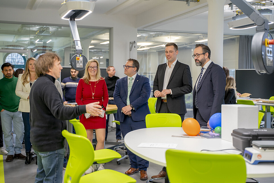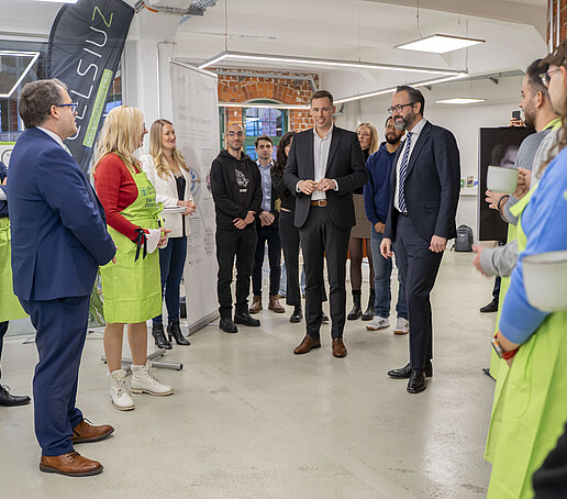 A visit to the DLR_School_Lab, the HSZG's school laboratory, and ZukLOS (Zukunftslernort Oberlausitz) at the HSZG marked the degree of the visit by the Saxon Minister of State for Science, Sebastian Gemkow, and the Member of the Bundestag, Florian Oest. Here, the team led by Dr. Thomas Fester presented the tasks and objectives of the school laboratory. The aim is to bring research to life for pupils and arouse enthusiasm for science and technology, also with a regional, national and international focus. "Many people with an international background also work here at ZukLOS. For us at the HSZG, it is very important that we can convey an international perspective to our visitors in addition to the scientific content," says Dr. Thomas Fester, Head of the DLR_School_Lab at Zittau/Görlitz University of Applied Sciences.