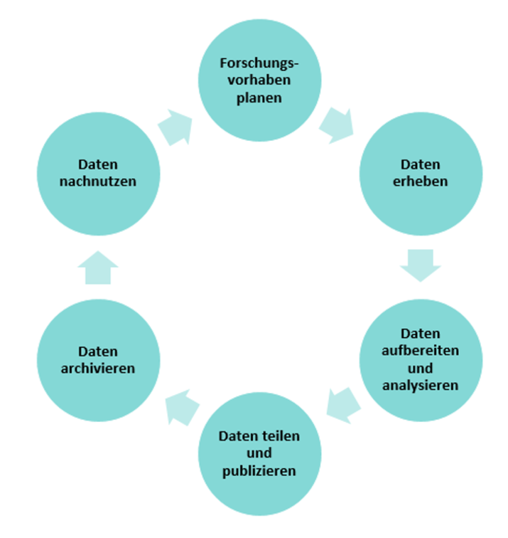 Das Modell des Datenlebenszyklus umfasst alle Phasen, die Forschungsdaten von der Erhebung bis zur Nachnutzung durchlaufen können. Die Struktur des Datenlebenszyklus variiert von Modell zu Modell, im Allgemeinen umfasst er folgende Phasen: