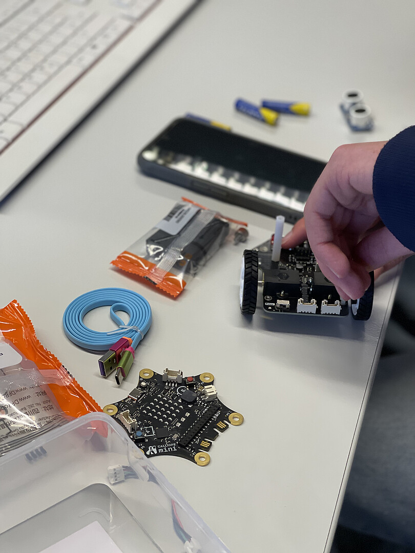 Nachdem die Grundlagen erlernt waren, folgte am 12.12.2025 der nächste Schritt: die Erweiterung des Calliope mini mit dem Motion Kit. Zunächst stand der mechanische Zusammenbau auf dem Programm, bei dem die Schülerinnen und Schüler ihre Roboter selbstständig montierten und dabei ein besseres Verständnis für die Hardware entwickelten. Anschließend wurde ein Parcours entworfen, dessen Verlauf durch einen selbst programmierten Zufallsgenerator bestimmt wurde.