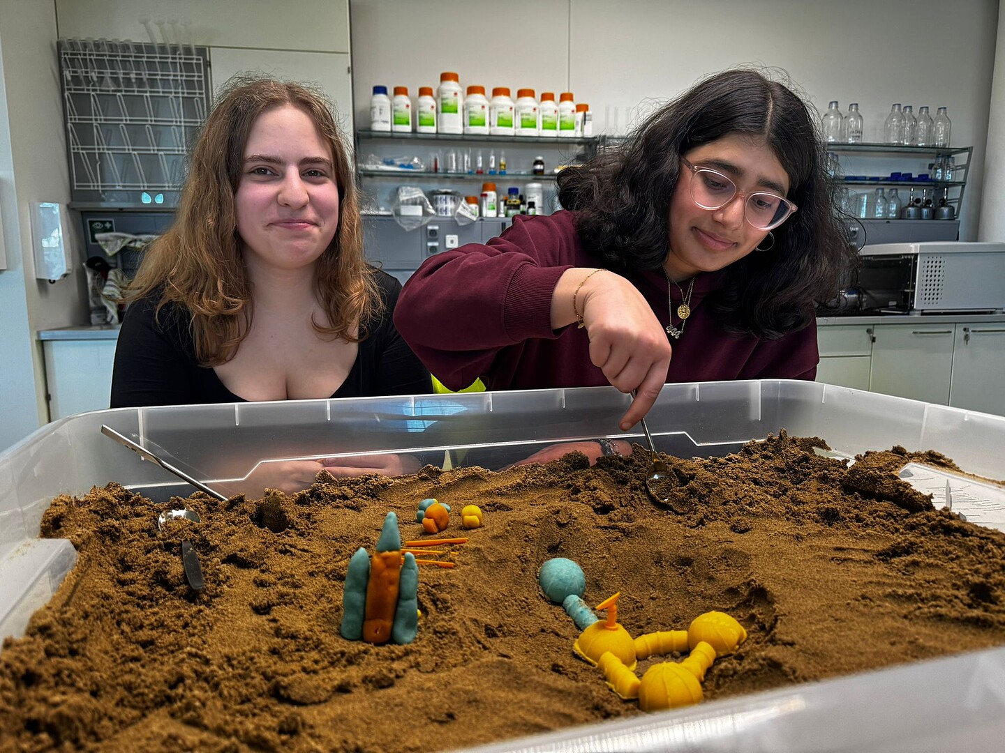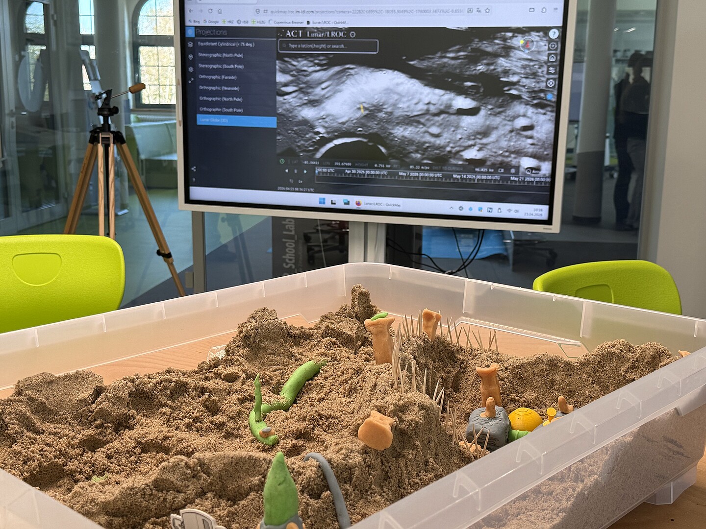 Im praktischen Teil entwickelten die Gruppen eigene Mondstationen. Zunächst wurden mithilfe eines digitalen Mondglobus (Darstellung der Daten des „Lunar Reconaissance Orbiter“ über das Programm „QuickMap“ geeignete Standorte ausgewählt und dokumentiert. Anschließend entstanden in Sandschalen modellhafte Nachbildungen der Umgebung, bevor eigene Stationen aus Modulen konstruiert wurden.
