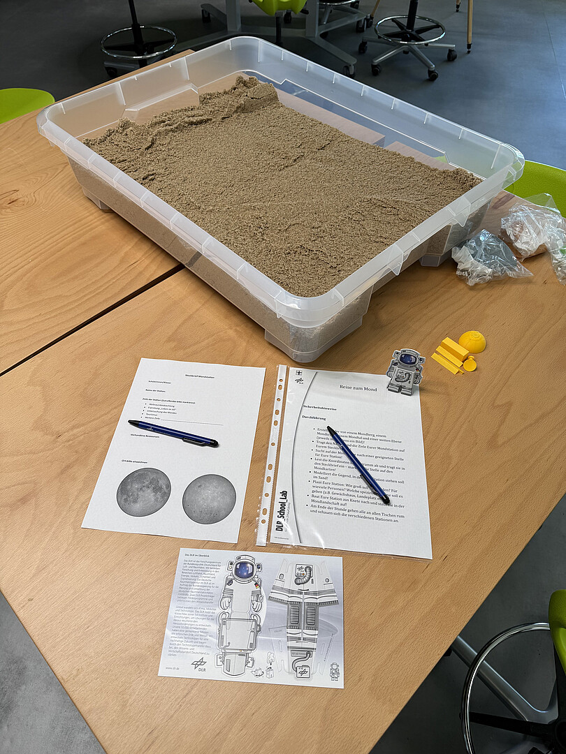 Im Rahmen des Projekttages wurden die Schülerinnen und Schüler zunächst in einem gemeinsamen Briefing in das Thema eingeführt. Ein DLR-Video „Zeitreise in die Zukunft“ stimmte auf die Mission ein. Anschließend ging es um die Topographie des Mondes, seine Besonderheiten wie die Rückseite des Mondes, gebundene Rotation sowie die sogenannten Mondmeere. Auch die dort vorhandenen Ressourcen wie Wassereis in Kratern am Südpol oder mögliche Schutzräume in Lavaröhren wurden thematisiert.