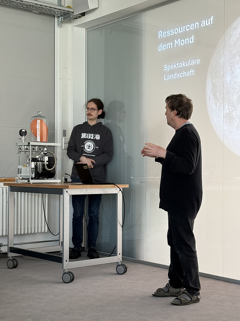 Ein weiterer Schwerpunkt lag auf den Herausforderungen des Lebens und Bauens auf dem Mond: extreme Temperaturschwankungen, Vakuum, Strahlung und Mikrometeoriten. Diese Bedingungen wurden unter anderem mit einem Vakuumversuch anschaulich demonstriert. Zudem beschäftigten sich die Schülerinnen und Schüler mit der Navigation auf dem Mond anhand von Längen- und Breitengraden und einem digitalen Navigationssystem.