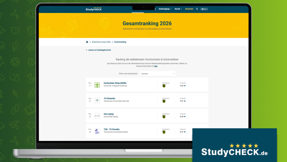 Die Hochschule Zittau/Görlitz gehört offiziell zu den beliebtesten Hochschulen Deutschlands. Im StudyCheck Ranking 2026, dem größten unabhängigen Studierendenranking in Deutschland, erreicht die HSZG Platz 19 von 113 bewerteten Hochschulen und zählt damit zu den Top 20 der beliebtesten Hochschulen und Universitäten bundesweit.