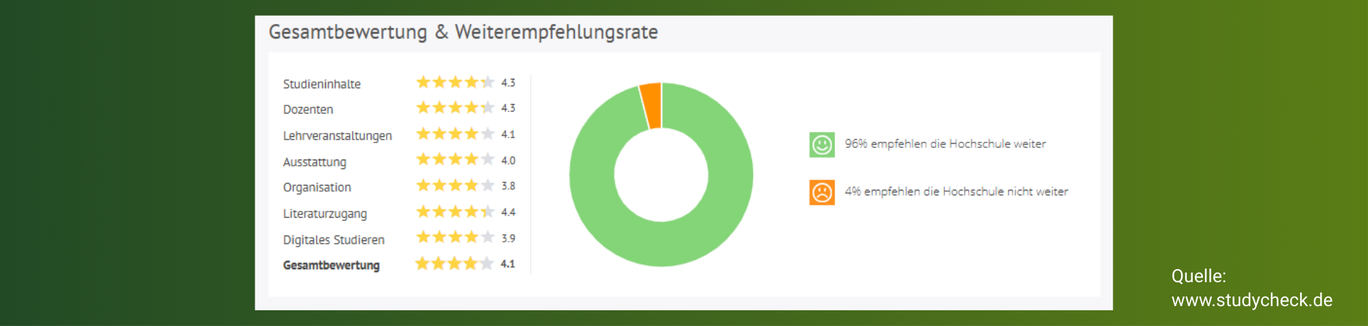 Diese hohe Weiterempfehlungsrate zeigt, dass Studierende ihre Hochschule nicht nur akzeptieren, sondern aktiv befürworten. Bewertet werden unter anderem Studienqualität, Betreuung, Praxisbezug, Ausstattung, Organisation und Campusleben.