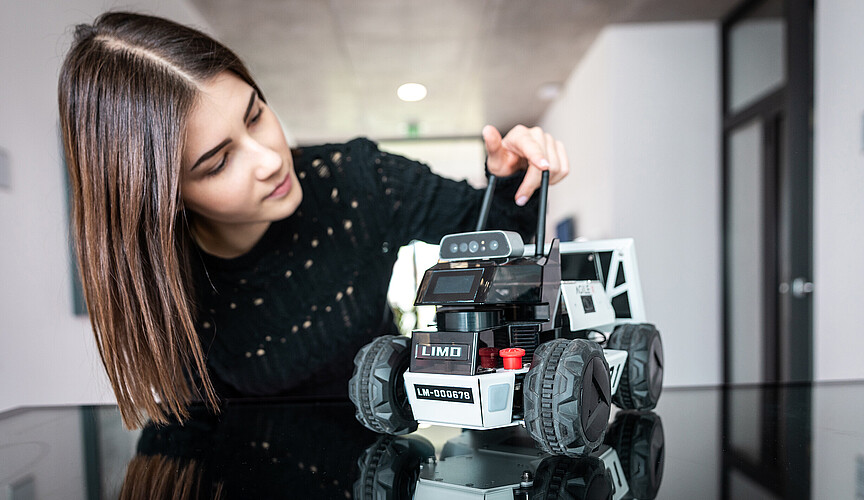 Du lernst, wie vernetzte Systeme kommunizieren und interagieren – vom autonomen Fahrzeug über Industrieroboter bis zur intelligenten Gebäudetechnik. Das praxisorientierte Konzept mit Laborversuchen in Kleingruppen, direkter Betreuung durch Professorinnen und Professoren sowie einem integrierten Praxissemester ermöglicht dir einen optimalen Berufseinstieg. Die Diplom-Arbeit im 8. Semester rundet dein Studium ab und bildet die Brücke in deine berufliche Zukunft.
