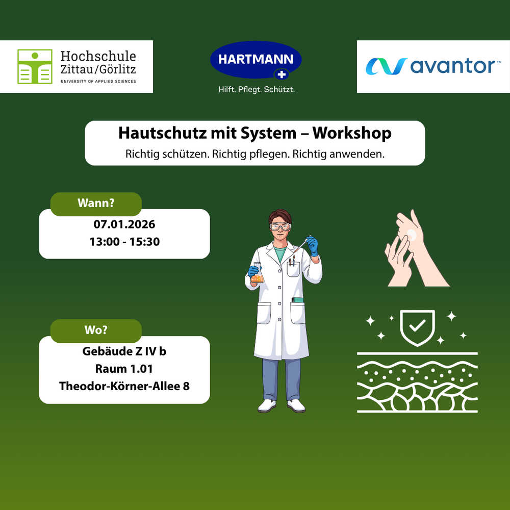 Diese und viele weitere Fragen werden im Workshop „Hautschutz mit System“ beantwortet. Die Veranstaltung richtet sich an Studierende, Mitarbeitende und Kolleg*innen der HSZG, die praktische Kenntnisse rund um Hautschutz, Handschutz und Hygienemaßnahmen erwerben möchten.