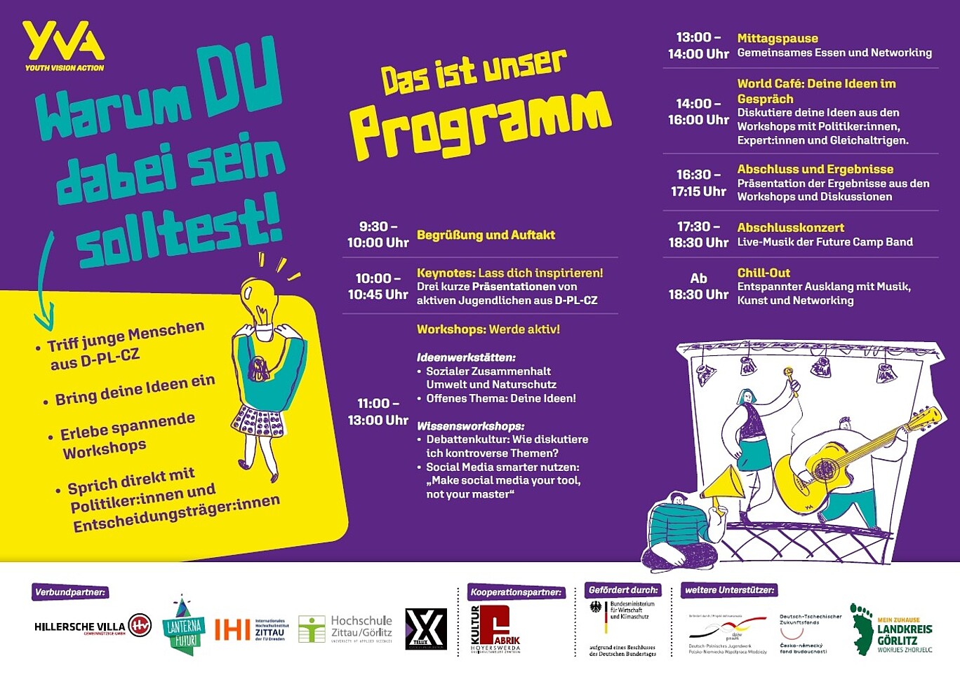 An diesem Tag arbeiten junge Menschen aus der Dreiländerregion an selbst gesetzten Themen zur Gestaltung ihrer Zukunft in der Region. Im Fokus stehen dabei der soziale Zusammenhalt in der Region, Mobilität sowie die sozial-ökologische Transformation. Neben Workshopangeboten können hier Jugendliche und lokale Akteur:innen aus Politik und Gesellschaft miteinander in Austausch kommen und an gemeinsamen Visionen arbeiten. Darüber hinaus wird es spannende Inputs junger „Role Models“ der Region geben, sowie ein künstlerisch-kreatives Begleitprogramm.